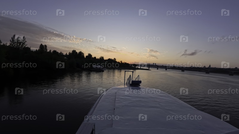 Корабль, плавающий по реке на закате солнца в сторону моста