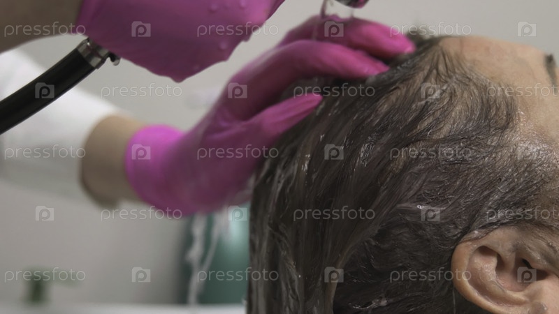Стилист выполняет успокаивающий массаж головы, Closeup Of Calming Hair Salon Scalp Massage With Water Stream.СМИ
