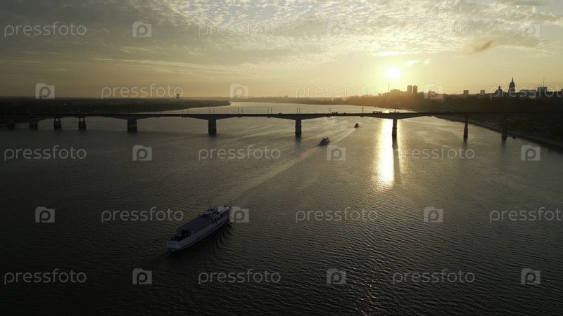Пассажирский паром пересекает реку на закате возле городского моста