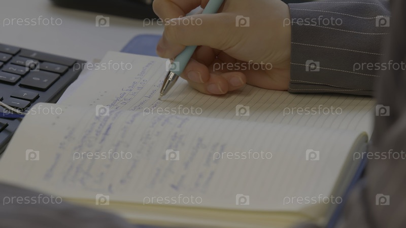 Преданный профессионал пишет подробные записи, сосредоточиваясь на работе за компьютером, демонстрируя высокую производительность