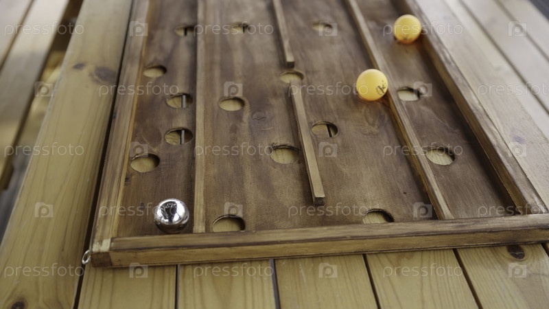 Это развлекательное видео демонстрирует деревянный лабиринт игры с двумя оранжевыми мячами для пинг-понга, которые навигируют по изготовленному лабиринту, обеспечивая захватывающий геймплей