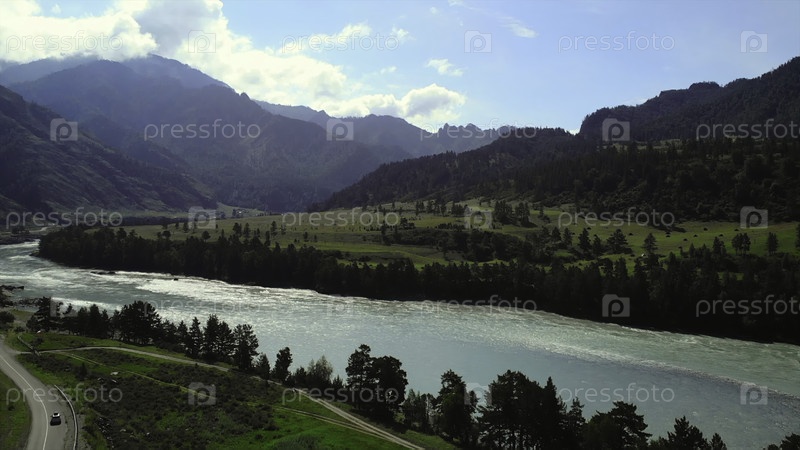 Красивая горная долина река течет с воздуха.Медиа