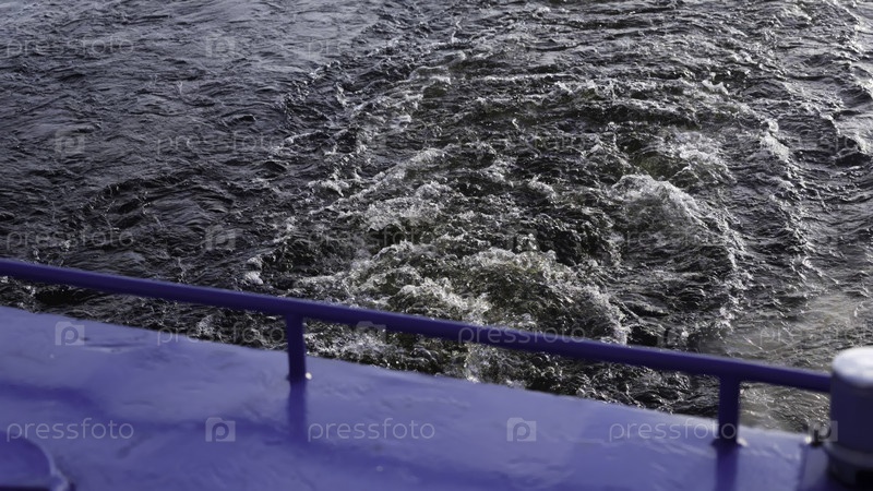 Синий корабль оставляет пенообразный след на поверхности воды