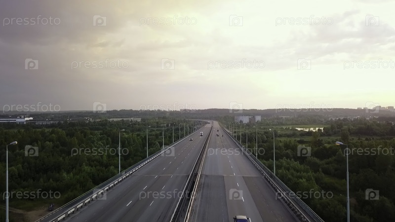 Вид с воздуха трафика на шоссе при закате солнца