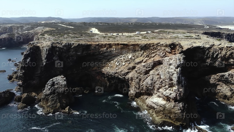 Шероховатые морские скалы с волнами, неровные горные образования среди бурных Атлантических волн и эрозии