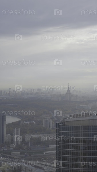 Панорамный вид, захватывающий растянувшийся городской пейзаж под тусклым серым небом, демонстрируя различные современные архитектурные проекты