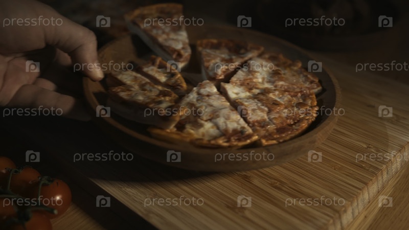 Рука берет вкусный кусочек домашней пиццы.СМИ