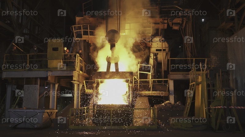 Расплавленный металл наливается в контейнер на сталелитейной фабрике