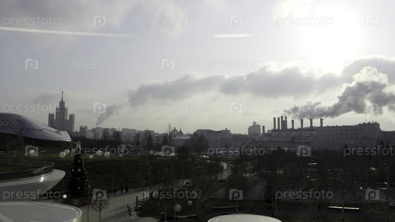 Московский городской пейзаж с промышленными дымоходами, излучающими загрязнение