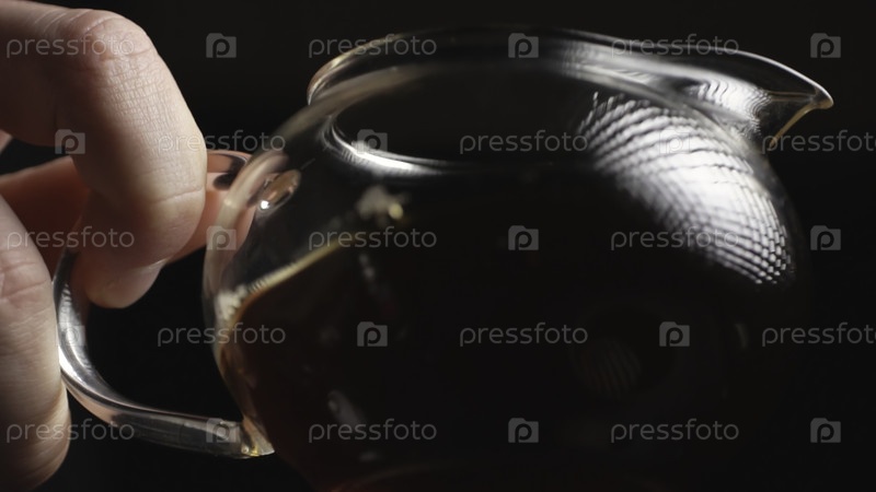 Красиво сделанный на близком расстоянии снимок руки, деликатно держащей стеклянный чайник, заполненный богатым темным заварным чаем.СМИ