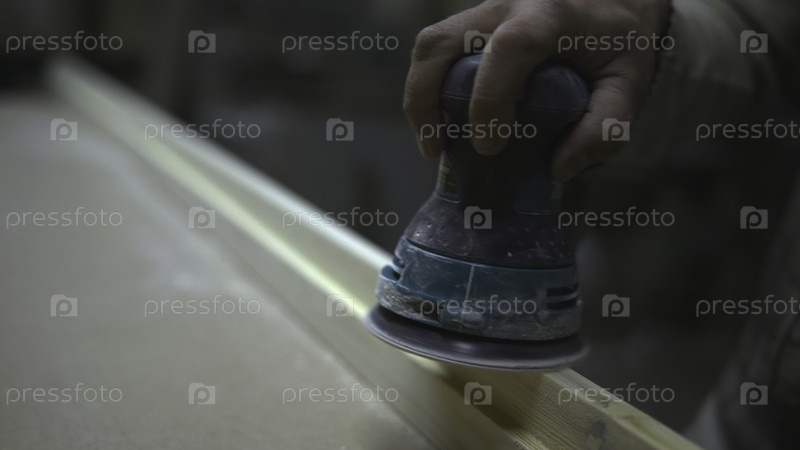 Используя орбитальный песок для полировки деревянной поверхности, пыль поднимается по мере того, как рабочий занимается гладкой отделкой древесины