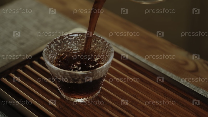 Спокойный визуальный вид чая, изысканно залитый в текстурированную стеклянную кружку, подчеркивая его богатые цвета и успокаивающую атмосферу