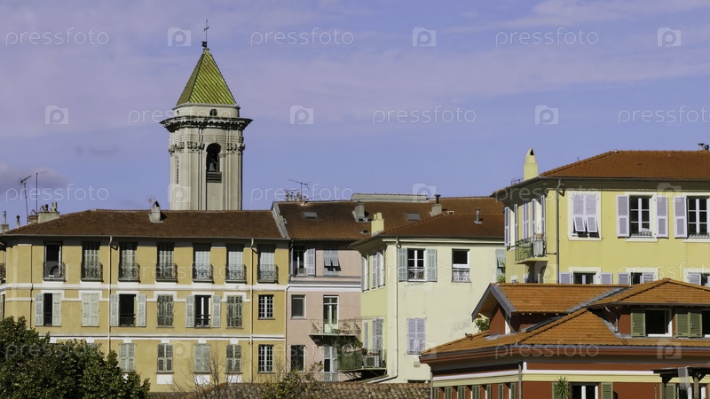 Красочные здания и церковная башня в Ницце, Франция
