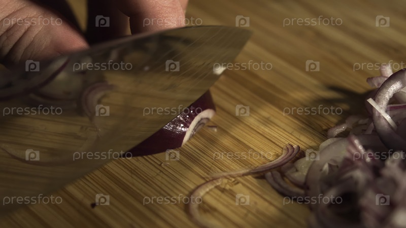 Повар нарезает свежий красный лук на деревянную доску для резки