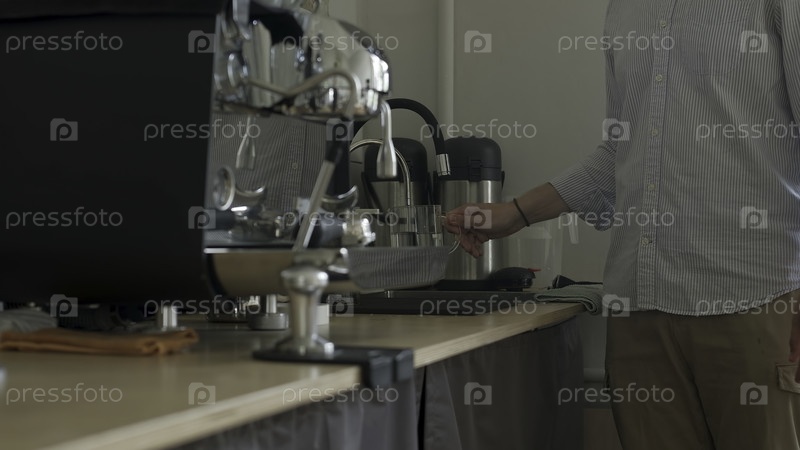 Опытный бариста, работающий с эспрессо-машиной в уютной среде кафе