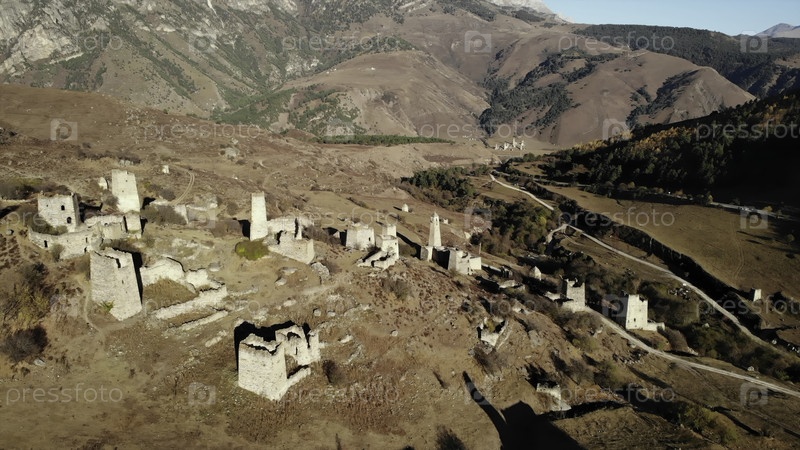 Вид с воздуха древних каменных башен в Кавказских горах.СМИ