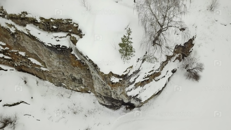 Красивый зимний пейзаж, демонстрирующий заснеженную скалу и рассеянные деревья под безмятежным небом