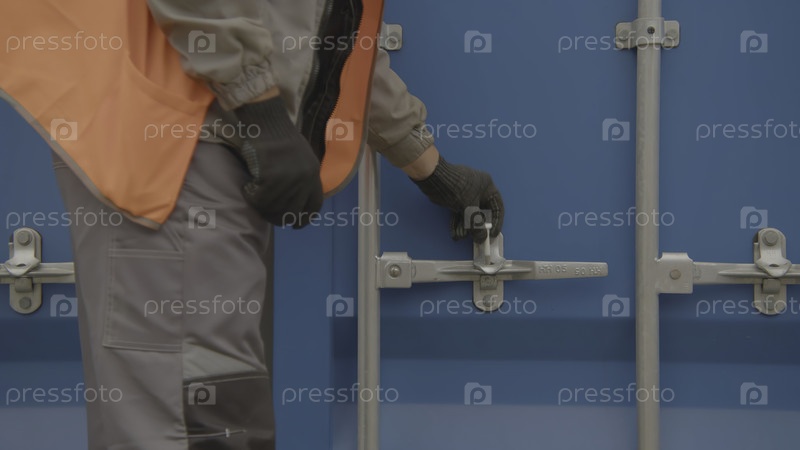 Работник закрывает замок промышленного контейнера. высококачественный видеоматериал 4k