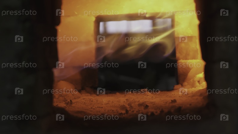 Горячий металл светит внутри кирпичной печи