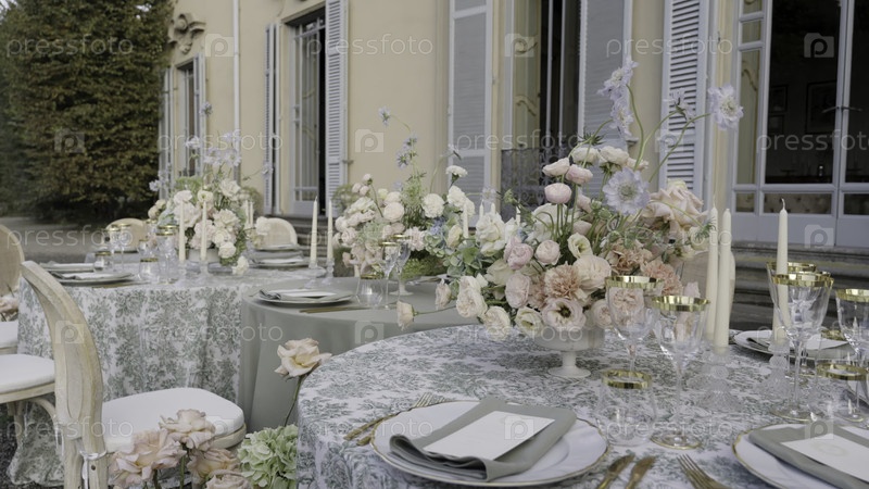 Элегантный стол для свадебного приема с цветочным центром в саду виллы