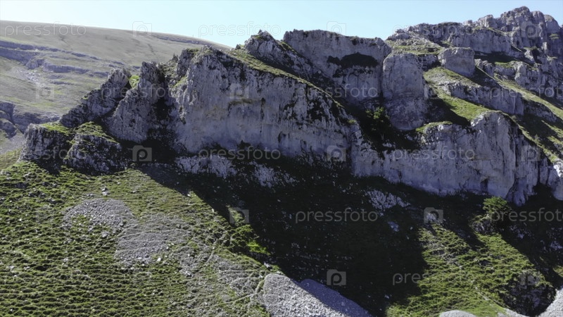 Вид с воздуха зеленого скалистого горного хребта.СМИ