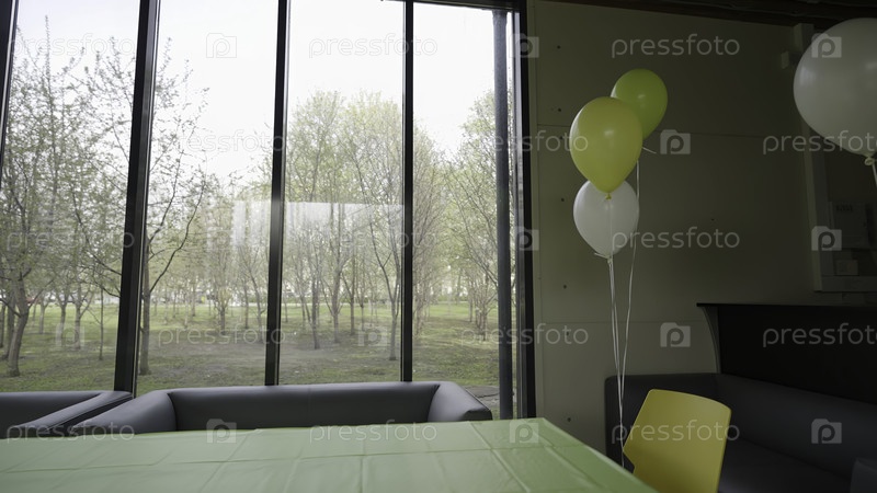 В видео показана веселая столовая, празднично украшенная зеленой скатертью, белыми стульями, красочными воздушными шарами и достаточным естественным светом