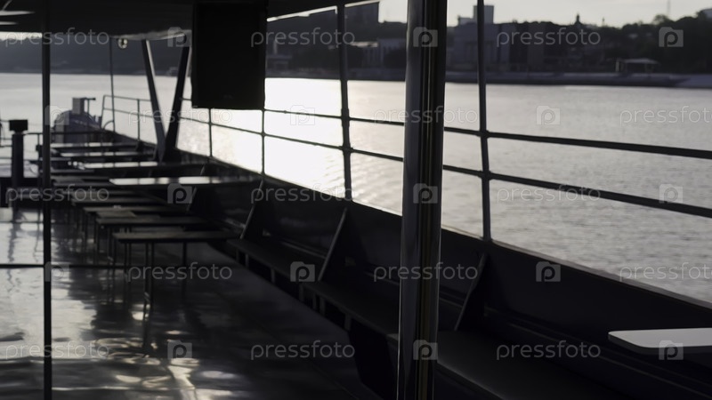 Пустая палуба пассажирского парома плывет по реке на закате