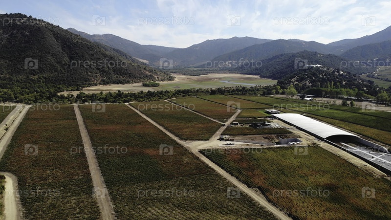 Вид с воздуха, летящий над осенними виноградниками и горными долинами