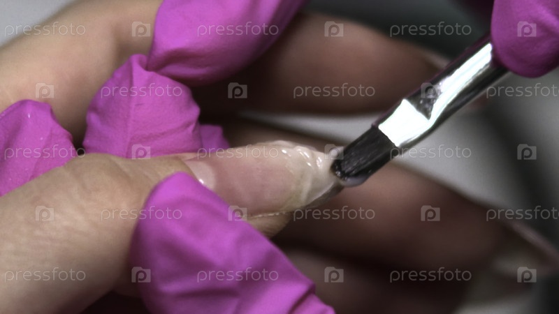 Тщательный техник использует металлическую шпатулу для идеальной поверхности расширения ногтей под ярким студийным освещением
