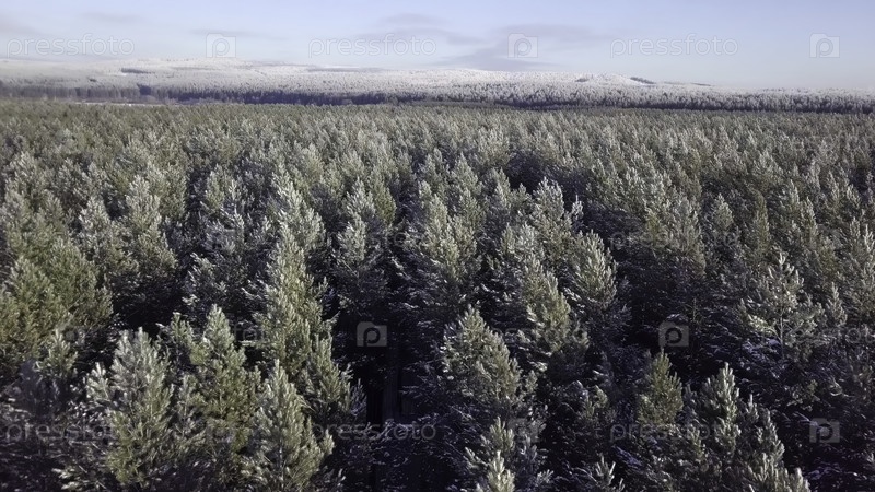 Захватывающий взгляд с воздуха, демонстрирующий морозный сосновый лес, окутанный холодной зимой