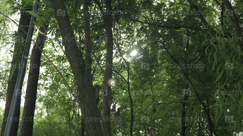 Белка, спускающаяся с дерева в зеленом летнем лесу