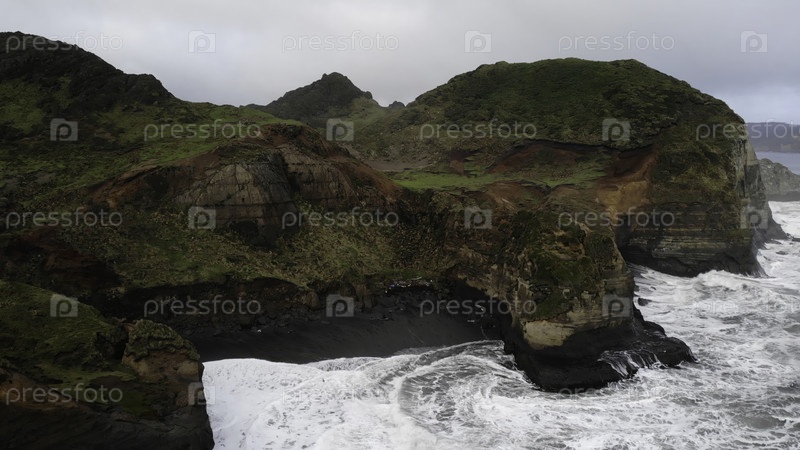 Океанские волны врезаются в скалистую береговую линию в пасмурный день