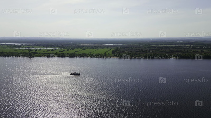 Грузовое судно, плавающее по широкой реке в солнечный день