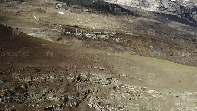 Удаленная горная деревня с воздушного вида осенний пейзаж.СМИ