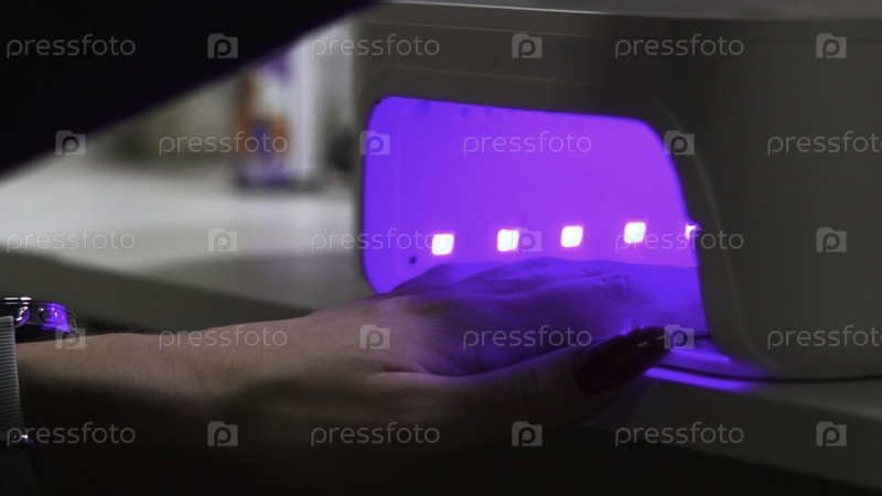 Процесс сушки маникюра, подробный взгляд на современного техника ногтей, выполняющего гелевую полировку в салоне
