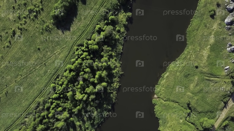 Потрясающий аэрофотосъемка демонстрирует спокойную реку, которая красиво окрашена яркой и пышной зеленой лиственницей