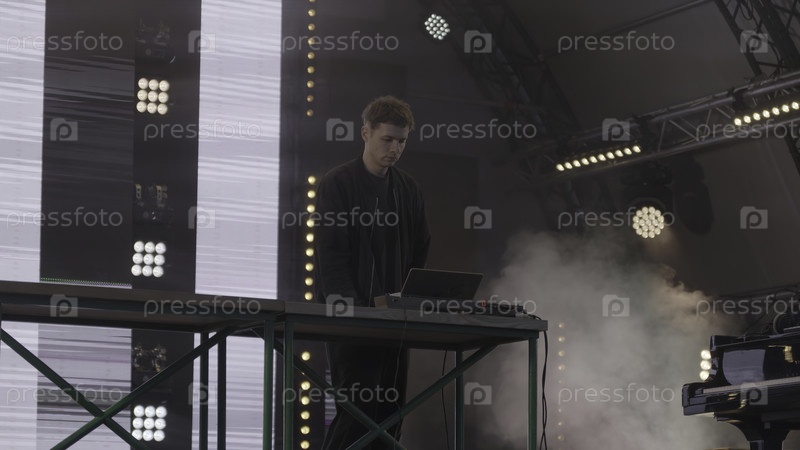 Художник демонстрирует живые выступления электронной музыки на сцене, предоставляя захватывающие и увлекательные визуальные эффекты