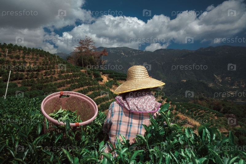 Уборка свежей зелени на солнечных горных полях среди спокойного, живописного пейзажа