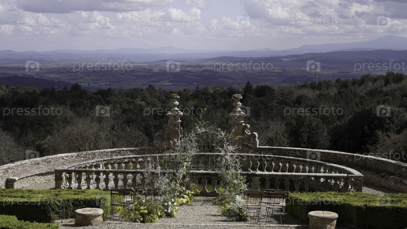 Свадебная арка с видом на тосканский пейзаж в курорте Castello di Vivo