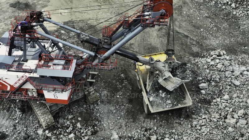 Экскаватор загружает камни на самосвалы в карьере