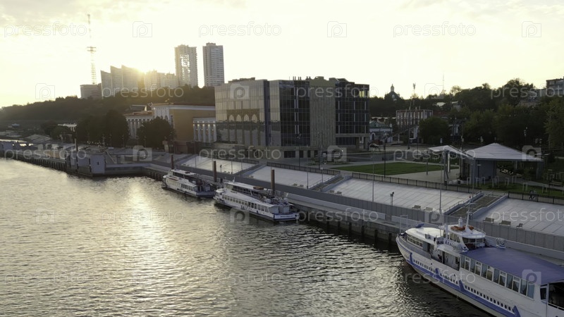 Пассажирские суда пришвартовались у набережной реки в городе при закате солнца