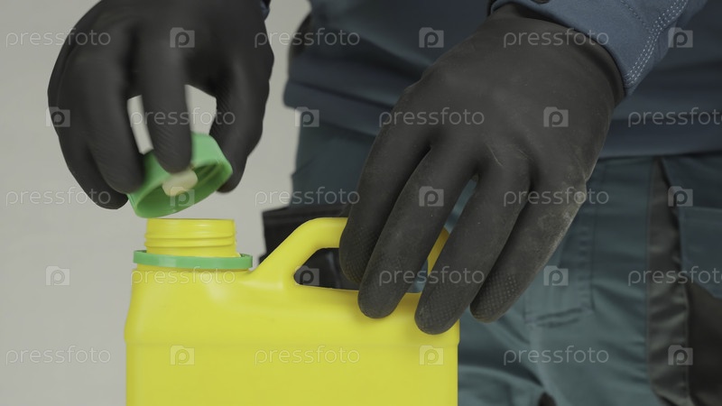 Обученный специалист по защитным перчаткам тщательно готовится к безопасному обращению с ярко-желтым химическим контейнером