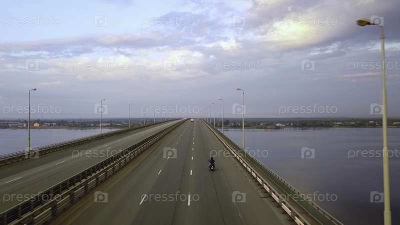 Мотоциклист едет на длинном мосту над водой при закате солнца