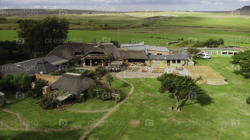Панорама деятельности лоджа, аэрофотосъемка, демонстрирующая строительство двора и окружающий ландшафт