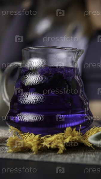 Получайте освежающий синий травяной напиток, который искусственно подается в элегантном и стильном стеклянном кувшине