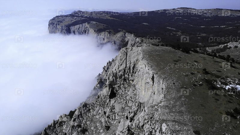 Вид с воздуха, летящий над скалистыми горными обрывами над облаками