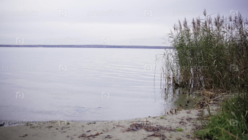 Спокойная береговая линия с тростниками и туманом, спокойная вода высокими растениями с мягким светом и рассеянными листьями