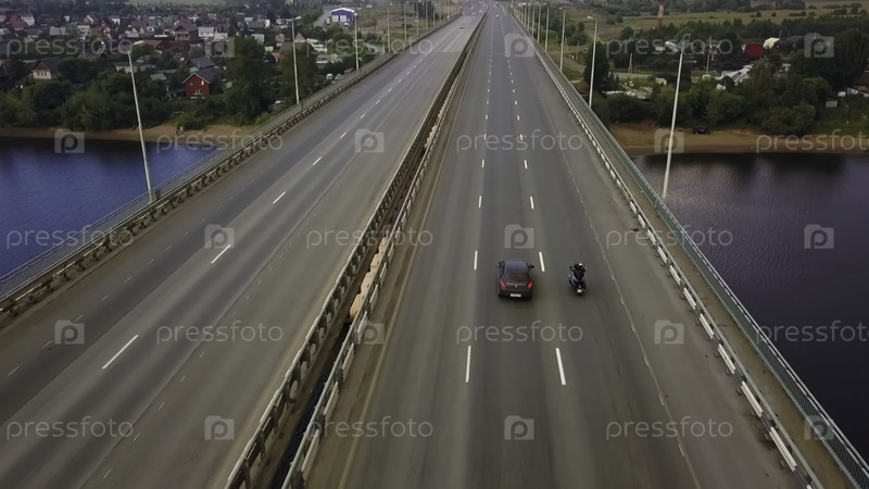 Аэрофотосъемка мотоцикла, едущего по мосту на шоссе