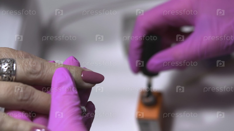 Снимок из непосредственной близости, показывающий точное покрытие ногтей с помощью специализированных инструментов и защитных перчаток
