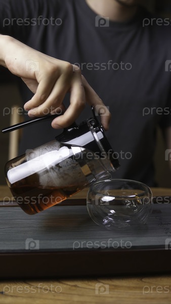 Человек грациозно наливает чай из красиво выполненного кувшина в стеклянную миску, опирающуюся на деревянную поверхность